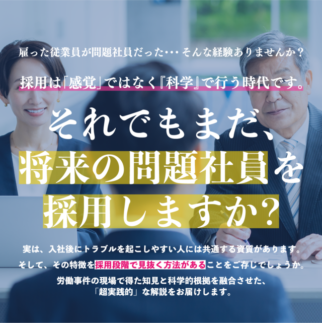 ・面接では人柄や雰囲気を重視して判断している ・その場の印象で「この人なら大丈夫」と採用している ・人材不足だから、多少の不安には目をつぶっている ・過去に「入社後すぐトラブルになった社員」がいる こんな採用、続けていませんか? もし一つでも当てはまるなら、その採用方法自体が、将来の労働トラブルを招いている可能性があります。 本動画では、 ・実際に起きた労働事件の共通点 ・トラブルを起こしやすい人材の特徴 ・採用段階で見抜けたはずのポイント など労働事件専門の弁護士が、実際の事件対応から得た知見を解説します。 福岡・大阪・東京で開催さいた本セミナーは、全参加者が「とても参考になった/参考になった」と回答した、超実践的な内容です。